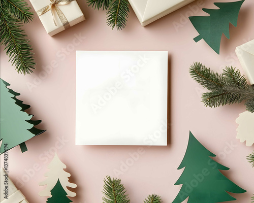 © mihnea, Fototapeta premium A white blank square card mockup card laying on top of pink green children paper cut outs christmas cut outs flat lay image white table natural lighting highresolut