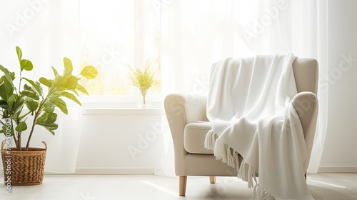 Fototapeta premium A white blanket draped over a single chair in a white living room used for...