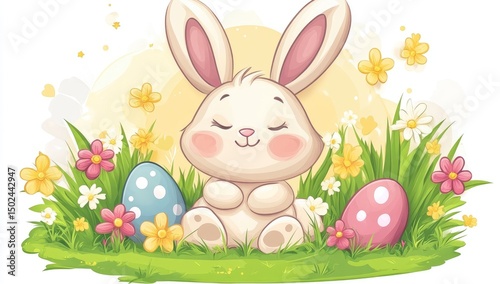 © HauraStd, Obraz premium A white bunny with closed eyes sits in a grassy field with flowers and colorful Easter eggs