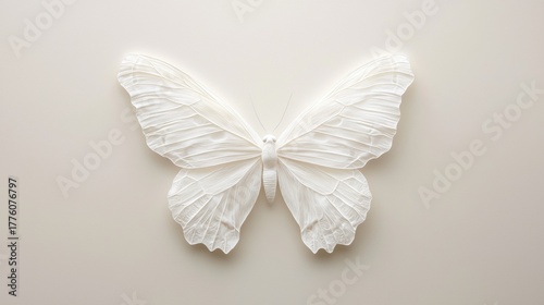 Obraz premium A white butterfly with long antennae and a short proboscis rests on a light beige background.