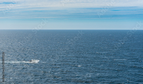 © Trygve, Fototapeta premium A white cabin cruiser crossing open seas.