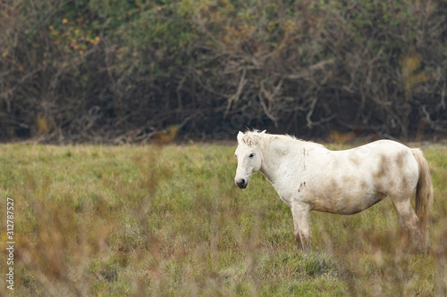 © Stefan, Obraz premium A white Camargue horse standing in a meadow