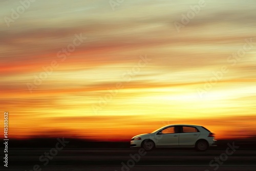 © FauziNh, Fototapeta premium A white car drives into a vibrant sunset