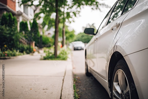 © rama, Fototapeta premium A white car parked on a city street. Blurred houses and trees