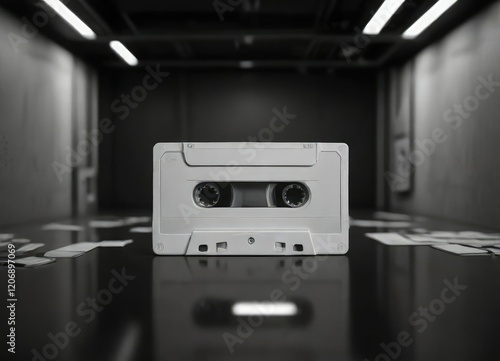 Obraz premium A white cassette tape in the center of a dark room , calm atmosphere,...