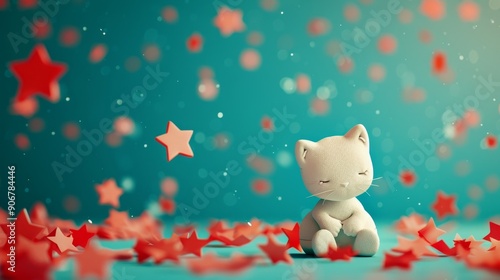 © Aris Suwanmalee, Obraz premium A white cat figurine sits amidst falling red stars on a teal background. The cat is closed-eyed and appears to be sleeping peacefully.