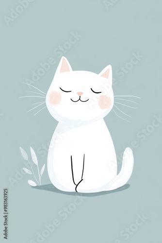 © Wall, Obraz premium A white cat sits on the ground with closed eyes before a plant