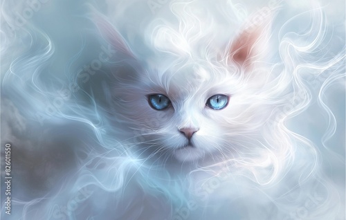 Fototapeta premium A white cat with blue eyes rendered in a fantasy art style.