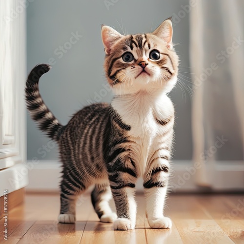 © Phongphan, Naklejka premium A white cat with fluffy fur gazes curiously at something off-screen