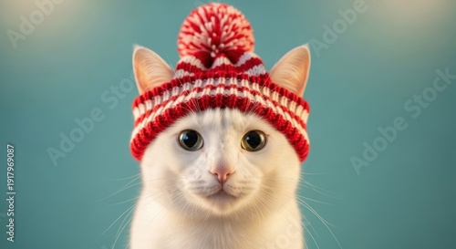 © Dece Std, Fototapeta premium A white cat with wide eyes wears a red & white striped knit winter hat, against a teal backdrop