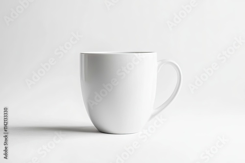 © Alexei, Obraz premium A white ceramic coffee mug featuring a handle is placed on a white surface