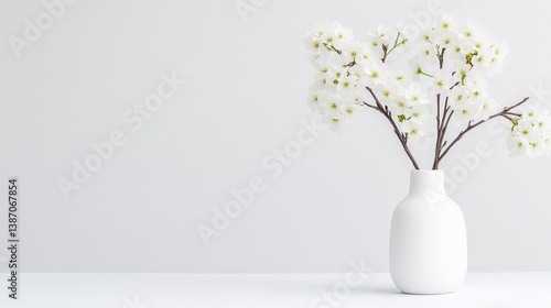 © Kaminashi Nozomi, Naklejka premium A white ceramic vase with delicate white flowers on a minimalist white surface, and soft lighting creating a serene and elegant composition.