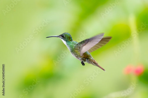 © Chelsea Sampson, Naklejka premium A White-chested Emerald hummingbird hovering in the air with a palm leaf blurred in the background.