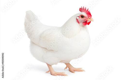 Fototapeta premium A white chicken with a red comb and a red beak stands on a white background
