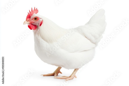 Fototapeta premium A white chicken with red comb and ear standing on a white background