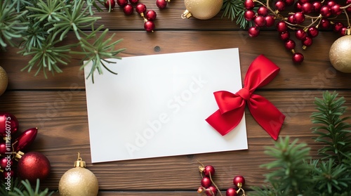 © mischenko, Obraz premium A white Christmas card with a red bow lies on a wooden table surrounded by Christmas decorations.
