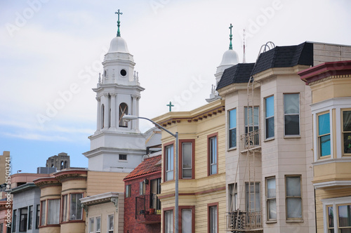 © Dan, Obraz premium A white church and victorian homes in a residential area within the city of San Francisco California.