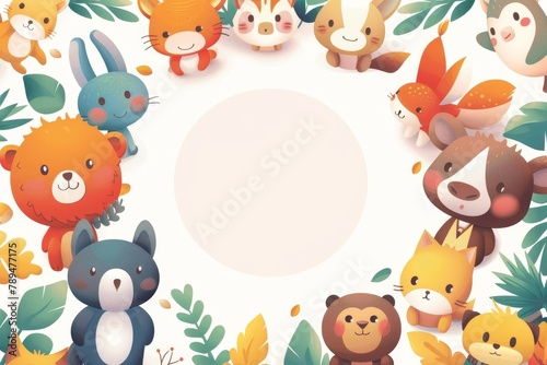 Naklejka premium A white circle in the center of an illustration surrounded by cartoon animals...