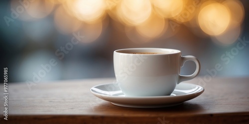 © LoFi J., Fototapeta premium A white coffee cup sits on a white plate on a table.