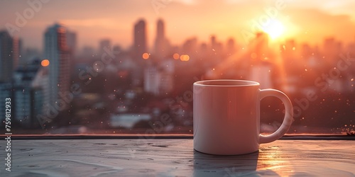 © Bussakon, Obraz premium A white coffee cup sits on a wooden table overlooking a city at sunset