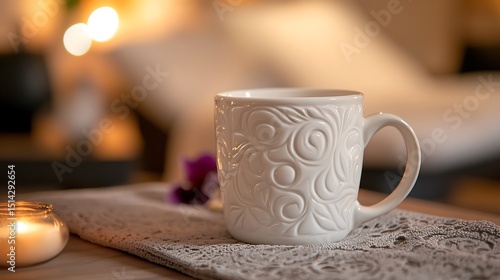 © Pixel Aria, Obraz premium A white coffee mug with intricate steam patterns white lounger blurred in the background