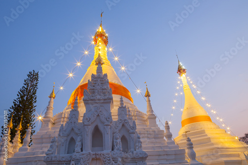 Naklejka premium A white color of pagoda decorated by lighting at night time under clear sky located at north of Thailand