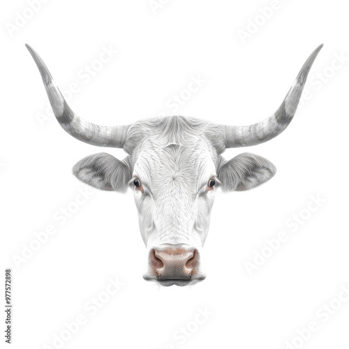 © Natthakan, Naklejka premium A white cow with horns is staring at the camera