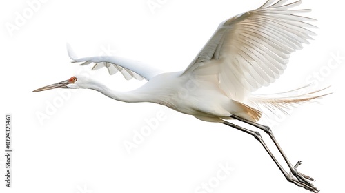 © Arfana, Obraz premium A white crane mid-flight, long legs trailing, isolated on a white background.