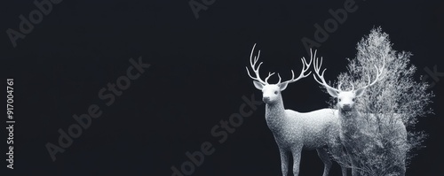 © Aris Suwanmalee, Obraz premium A white deer with large antlers stands in front of a dark background.