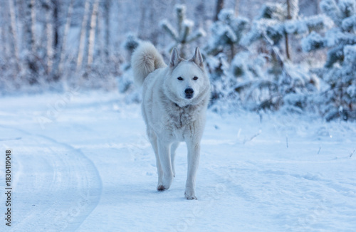 © schankz, Obraz premium A white dog is walking on a snowy road