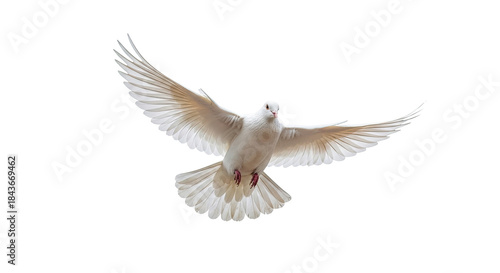 © UnPhouvith, Fototapeta premium A white dove flying against a white background.