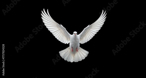 © Falih, Obraz premium A white dove in flight against a black background, with wings spread wide