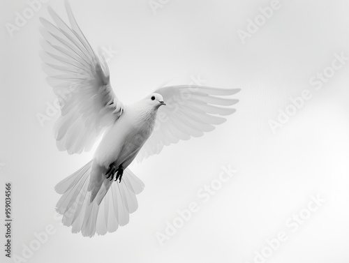 Fototapeta premium A white dove in flight, wings spread wide, against a plain white background.