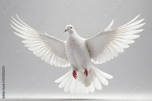 © Ficky, Fototapeta premium A white dove in mid-flight against a plain backdrop