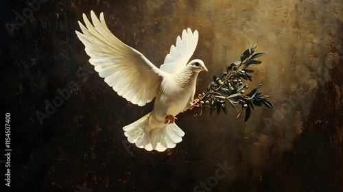 © ABC IMAGE, Obraz premium A white dove in mid-flight, carrying an olive branch, representing peace