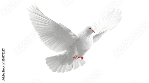 © Pickoloh, Obraz premium A white dove in mid-flight with wings spread wide against a white background