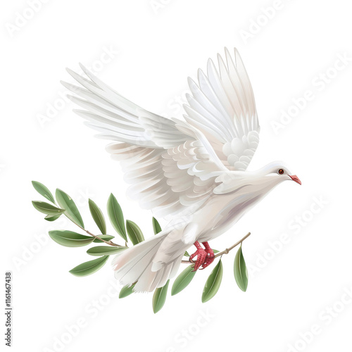 Obraz premium A white dove peace flying with a green olive twig, isolated a white background, symbolizing harmony
