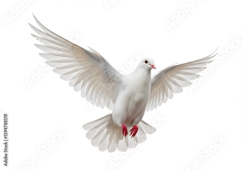 Fototapeta premium A white dove soars with outstretched wings against a stark white background in a studio setting isolated on white background