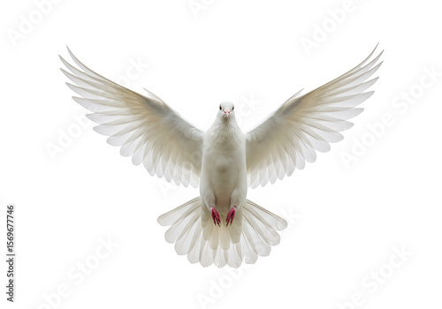 © Muaz, Obraz premium A white dove with its wings spread wide is flying, isolated on transparent background