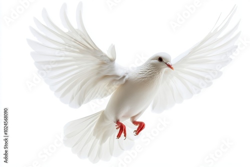 Fototapeta premium A white dove with spread wings is captured mid-flight, with its wings extended and soft feathers