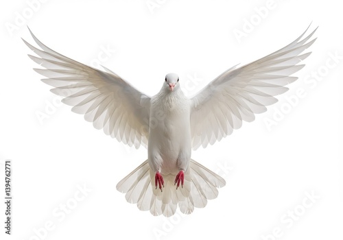 Obraz premium A white dove with wings spread wide against a bright white background in a studio setting view from front isolated on white background