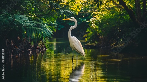 © Crafted, Obraz premium A white egret stands in a tranquil lagoon with lush green vegetation surrounding it.