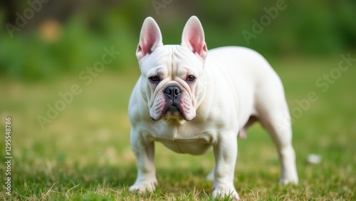 © ArtPro, Fototapeta premium A white English bulldog standing on grass, looking directly at the camera.