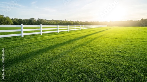 © OZTOCOOL, Obraz premium A white fence with shadows cast on emerald grass by the midday sun.