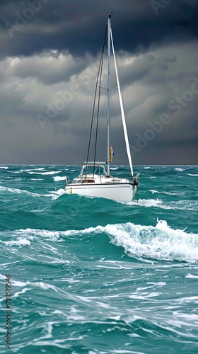 © lililia, Naklejka premium A white fishing boat navigates through rough waves with whitecaps in the foreground, with a cloudy sky in the background