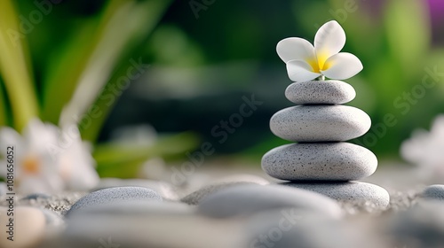 © Ilona, Fototapeta premium A white flower sitting on top of a pile of pebbles