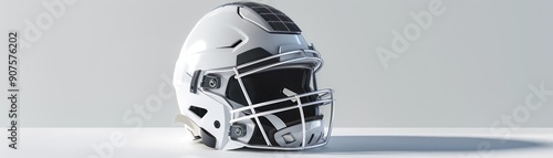 © peerasak, Fototapeta premium A white football helmet with a black face mask. The helmet is placed on a table. The helmet is a symbol of protection and safety, which is important in sports like football
