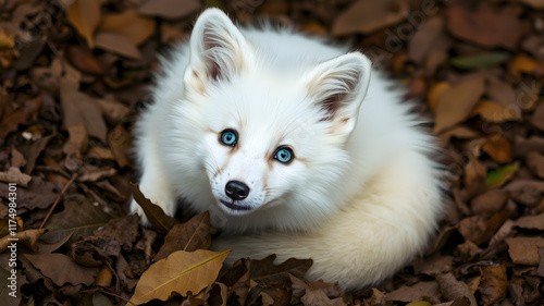 Fototapeta premium A white fox with blue eyes lying on a bed of leaves, looking up with a...