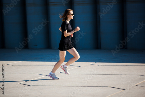 Fototapeta premium a white girl with short blonde hair in black clothes and light sneakers runs...