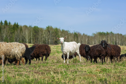 Fototapeta premium A white goat and a herd of sheep in a pasture in the spring.